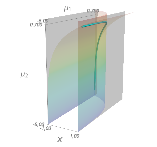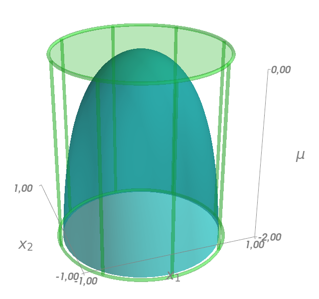 $$ \MM = \{(x_1, x_2, \mu) \in \RR^3: x_1^2 + x_2^2 + \exp(\mu) - 1 = 0 \} $$