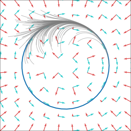 $$ \dot{\vxi} = \begin{bmatrix}\dot{\vs} \\ \dot{\vmu} \end{bmatrix} = \textcolor{#FF3E3E}{\underbrace{-\lambda \mJ_c^{\dagger}c(\vxi)}_{\text{Contraction Term}}} + \textcolor{cyan}{\underbrace{\mathcal{B}_c \va}_{\text{Propogation Term}}} $$