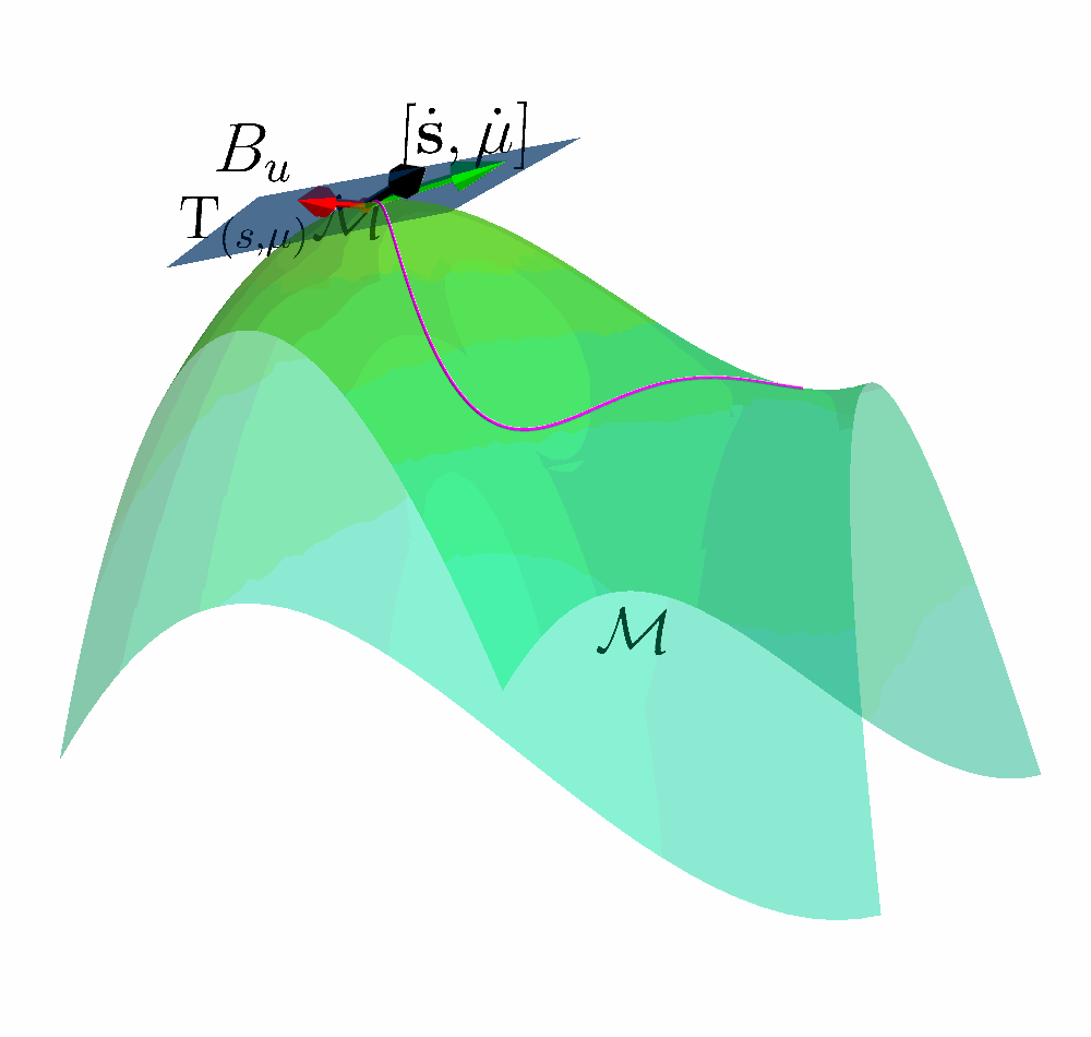 Constraint Manifold in Augmented State Space $$ \MM = \left\{(\vs, \vmu) \;|\; k(\vs) + \vmu = 0 \right\} $$